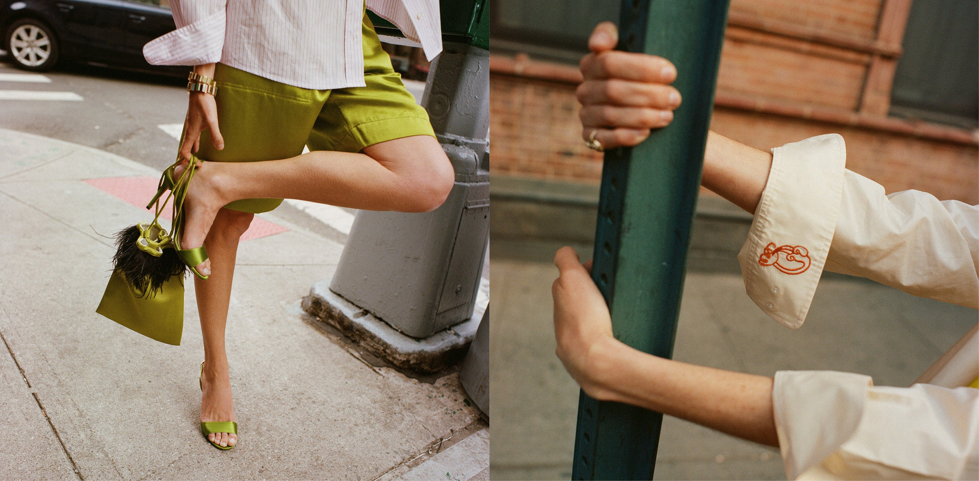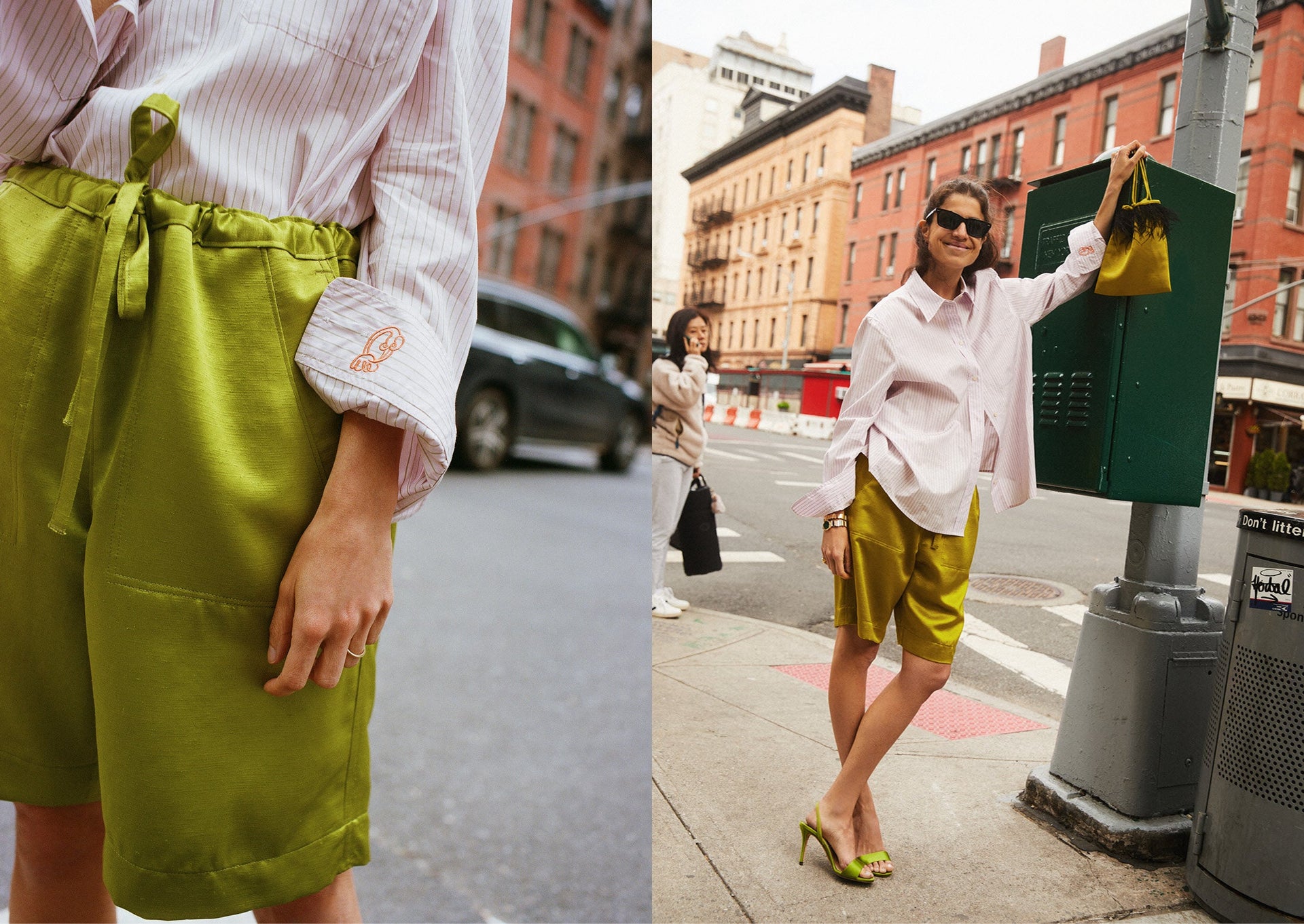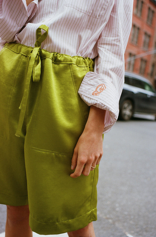 Una camisa de rayas oversize en popelín con predominio del rosa y el verde pálido, shorts de shantung verde, un clutch bimateria del mismo tejido para puntuar el look y un total look marfil : llevado sobre las arenas de la playa o los adoquines de la ciudad, las cinco piezas de la colección combinan elegancia y desenfado.