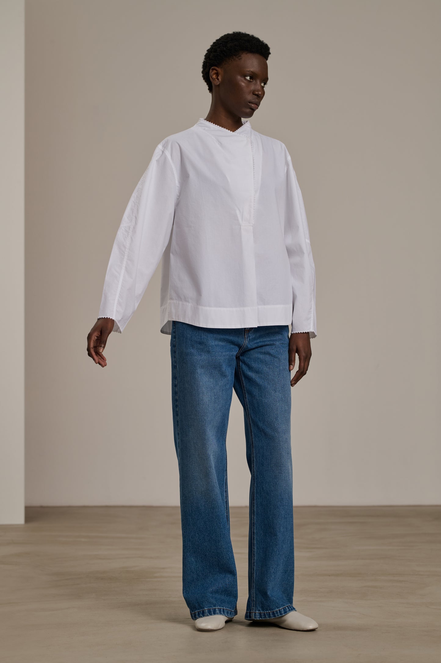 BERRY es una camisa de popelina de algodón con corte recto. Las mangas largas y el cuello se destacan por un delicado detalle de bordado, añadiendo una nota de feminidad sutil. Una camisa aparentemente clásica que combinará bien en tu guardarropa.